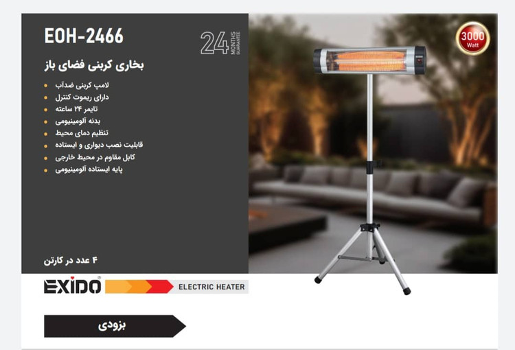 یکی از مزیتهای مهم این بخاری، دو حالت نصب دیواری و ایستاده است که بسته به نیاز شما قابل استفاده است. پایه آلومینیومی محکم آن علاوه بر ثبات بالا، زیبایی خاصی به ظاهر دستگاه میدهد. با بخاری کربنی فضای باز اگزیدو مدل EOH2466، در هر شرایط آبوهوایی از گرمایی دلپذیر و آرامشبخش لذت ببرید.